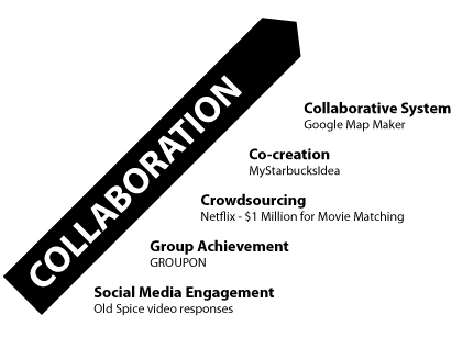 Onderdeel van zijn presentatie was de stelling dat online interactie tussen fans en merken uit een vijftal stadia bestaat. Ik vond dat een interessant overzicht, ook omdat de diverse termen vaak door elkaar gebruikt worden. Vandaar dat ik het model even gereproduceerd heb, inclusief een voorbeeldcase.