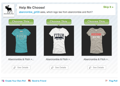 Shopstyle.com laat klanten kledingstukken combineren tot looks. Andere kunnen die waarderen, commentaar toevoegen of delen met anderen. En natuurlijk deze looks kopen. Polyvore.com doet hetzelfde en presenteert deze looks bij kledingstukken. Ofwel, je ziet niet alleen een jurk, maar ook wat je er allemaal mee kan. Bij Kaboodle.com kun je je vrienden laten zien wat je wilt kopen. Zij kunnen er dan op stemmen en je bij twijfel het juiste duwtje geven.Jansport gebruikt Facebook Connect. Zo kun je delen wat je wilt kopen en zien wat anderen vinden van Jansport-producten.
